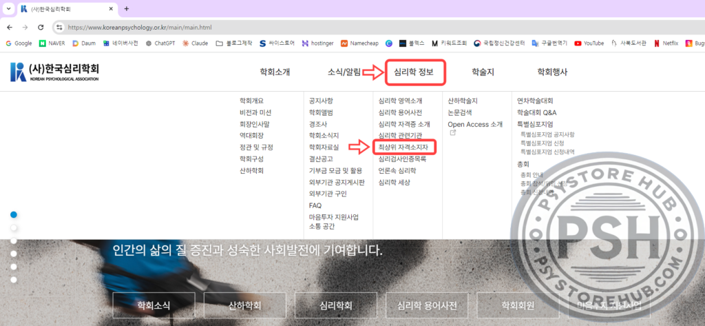 상단 메뉴란에 심리학 정보에 마우스 커서를 놓으면, 하단 메뉴중에 최상위 자격소지자라는 메뉴가 나옵니다. 해당 메뉴를 클릭합니다.