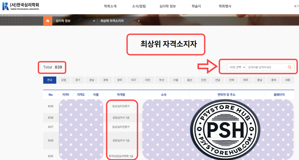 해당메뉴를 클릭하면 최상위 자격소지자 화면이 나타나고, 지역별로 각 시/도를 선택할 수 있습니다. 2024년 9월 기준 총 839명이 등록되어 있습니다. 자격증별로 보면, 임상심리전문가, 상담심리사 1급, 한국상담심리학회 1급 등으로 구분되어 게제되어 있습니다.