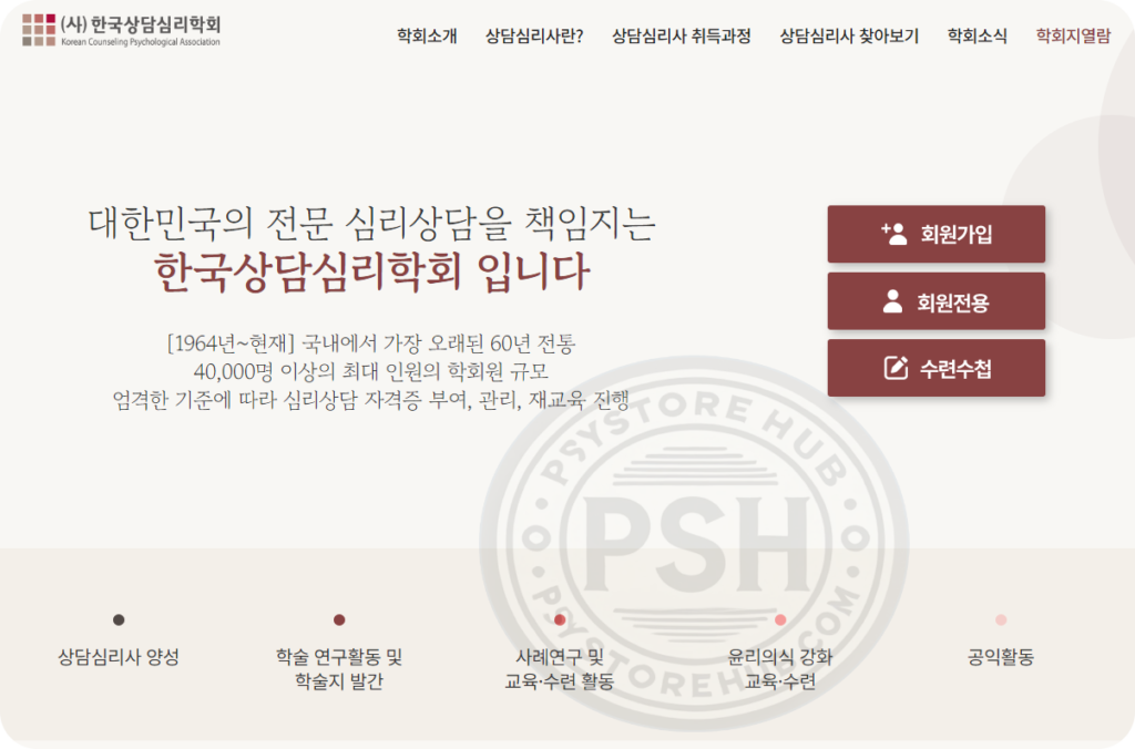 한국상담심리학회는 60년 전통의 학회로, 4만명 이상의 최대 인원의 학회원 규모를 가지고 있습니다.