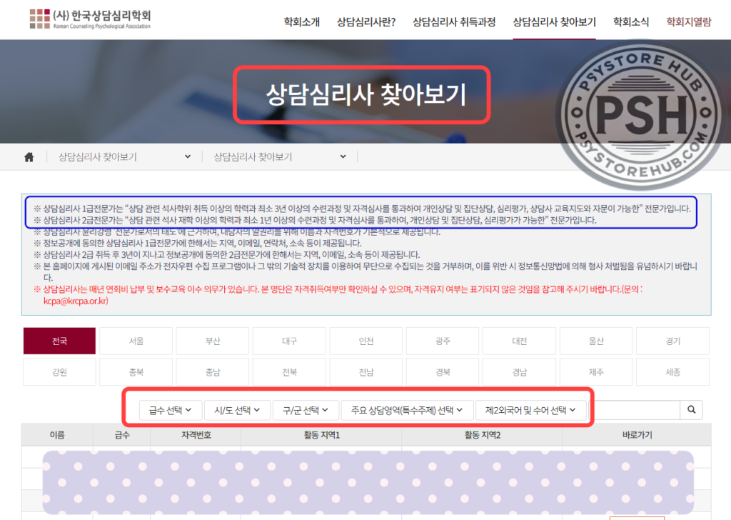 심리상담 관련 학회에서는 관련 자격증 소지자를 지역별로 검색할 수 있는 정보를 제공하고 있습니다.