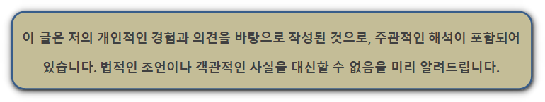 이 글은 저의 개인적인 경험과 의견을 바탕으로 작성된 것으로, 주관적인 해석이 포함되어 있음을 알려드립니다. 법적 조언이나 객관적인 사실을 대신할 수 없으므로, 이 글의 내용을 참고하실 때 이러한 점을 유념해 주세요.