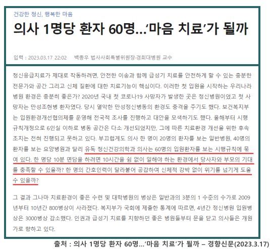 정신건강복지법이 규정하는 정신과 병원 의사 1인당 적정환자 수는 60명이라고 합니다.